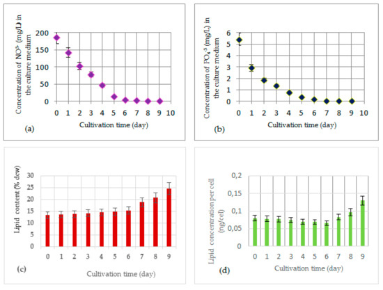 Production of total lipids in R. subcapitata immobilized in alginate beads, over a period of 10 days (culture performed in batch and in duplicate). (a) Nitrate consumption; (b) phosphate consumption; (c) variations in lipid content per dry weight of cells; (d) variations in lipid concentration per cell. t0 = d1.