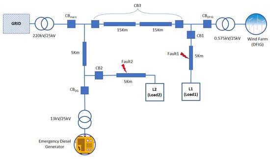 For the purpose of analysis and investigation of the system protection during any fault incident, modeling and simulation of the interconnected system plays a crucial role in evaluating the functionality and performance of the protection system. Therefore, to address a real-world scenario in the operation of an interconnected distribution network, a distribution network interconnected with DERs such as DFIG wind turbines and DG has been developed. Figure 1 shows a single line diagram for a distribution network which is connected to the grid through CBmain. The local power generation units at the distribution level consist of a wind farm with DFIG type wind turbines and DG which acts as frequency controller to distribution system during the islanded mode operation when CBmain is open. Also, Load1 (L1) and Load2 (L2) represent local loads supplied by both grid and local generation sources (DFIG and DG). In addition to that, the sizing and capacity of the local generation sources have been selected to be able to supply the local loads (L1 and L2) during islanding operating mode which is a desirable characteristic to form an islanded distribution system. The CBs illustrated in Figure 1 have been devised to operate and isolate faulty section(s) of the distribution lines with trip signals which are sent by protection IEDs associated to each CB. It is also worth mentioning that there are two fault scenarios, Fault1 and Fault2, shown in Figure 1, which are considered to evaluate the system protection performance against conventional approaches. Finally, CB1, CB2, CBmain and CBDFIG are configured to operate with TOC protection function while CB3 (shown in Figure 1 as a pair of CBs) is considered to operate on a differential protection function.