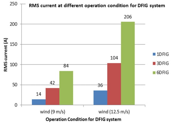 In relation to connecting DERs such as DFIG systems into distribution networks, there are operational aspects corresponding to embedded control strategies and sizing of the DFIG systems which can introduce technical complexities in devising protection settings. As a matter of fact, variations in wind speed over a wind farm area can affect the power output from DFIG wind turbines altering the load-generation balance by causing changes in the operating conditions at each CB location. Thus, with respect to conventional approaches, the protection settings for TOC curves have to be adjusted accordingly to ensure reliable and safe operation of the interconnected distribution network. In order to highlight variations in operation conditions at different CB locations within a interconnected distribution network, Figure 2 and Figure 3 represent normal loading currents for different wind speed and size of the DFIG wind turbines, respectively. Figure 2 represents the root mean square (RMS) currents at the point of common coupling (PCC) connection of the DFIG system (CBDFIG) which can vary depending on the available wind speed and the number of connected DFIG systems in the wind farm.