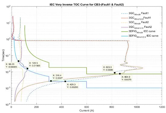 It is obvious from Figure 4 that under different operation mode, the requirement for the adjustment of the protection settings within the protection IEDs is inevitable. Also, to further investigate the time domain performance of a TOC curve devised for conventional system protection, comparisons have been made for fault currents at CB1 and CB2 under different modes of operation to highlight the protection complexities within an interconnected distribution network. As seen in Figure 5, the time domain responses of the fault currents during islanded operation mode are not detected by the TOC curve as the fault current level and fault current duration are not sustained for the minimum time required to trigger a trip for the corresponded protection IEDs. Therefore, it is essential for system protection that the TOC curve settings be adjusted according to the operation mode of the interconnected distribution network. In Figure 5 the notation for GCsubscript follows the same notation as explained for Figure 4, however the prefixed number and fault suffix correspondingly represent the number of DFIGs connected to the grid and the fault locations. For example 3GCwind9 Fault1 represents a fault current curve at CB3 when a 3-phase fault occurs at the Fault1 location and the number of DFIG systems connected to the grid is three. Also the International Electrotechnical Commission (IEC) curves highlight the TOC protection functions based on the fixed pickup current settings at CB3 locations with consideration of the DFIG operation conditions.