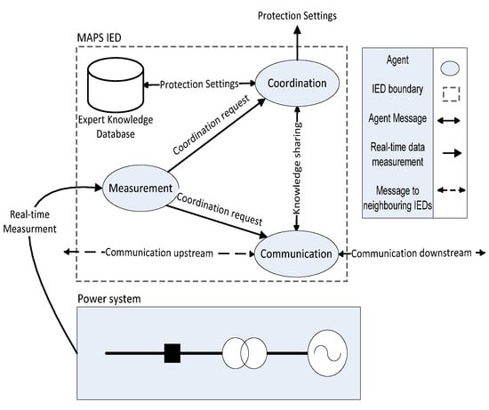 As explained earlier, by integrating MAS into a protection system, there are certain characteristics and features such as cooperative behavior, distributed architecture and scalability which highlight the desired flexibility to model large-scale interactive complex networks similar to protection schemes within interconnected distribution networks. As a matter of fact, in the proposed MAPS strategy, MAS constitutes the core of a decision-making process where protection tasks are fulfilled through different subtasks and in cooperation with other protection IEDs deployed within the interconnected distribution network. Thus, unlike the conventional approach, MAPS aims to support the functionalities of the system protection by considering wide area information to identify the prevailing changes within the power system network. This in turn introduces advantages for accurate and reliable decision-making processes to select appropriate protection group settings according to the operating condition of the interconnected distribution network. In order to illustrate the detailed interactions and cooperation between the elements within MAPS, Figure 6 represents a use case scenario where messaging communication and different agent types are shown. As shown in the figure, the real-time measurement data including current transformers (CT) and voltage transformers (VT) values are the inputs from the power system into the protection IED specified with a dashed line boundary. Measurement, communication and coordination agents deployed within the protection IEDs illustrate the cooperative behavior between each agent through messaging exchange. Also, the output from the MAPS architecture shown in Figure 6 is the protection group settings which are derived from the expert knowledge database based on heuristic reasoning defined in the next subsection.