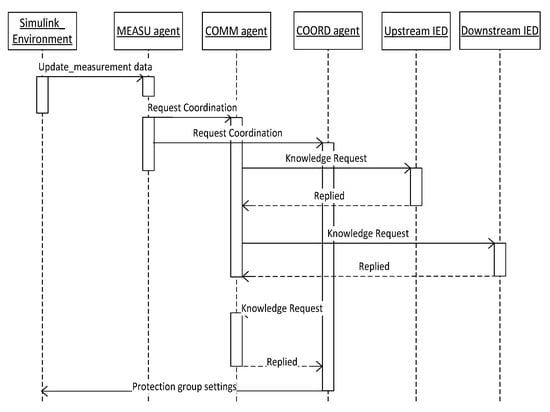 The core of decision-making and incorporation of the heuristic rules for adjusting the protection settings in each protection IED is implemented in the coordination agent. In fact, the coordination agent demonstrates a distributed decision-making entity where measurement information are collected and taken into account for evaluation against the heuristic knowledge that forms the reasoning basis to select proper protection settings from the existing setting groups in protection IEDs. In order to be able to develop a fully automated protection system based on protection agents as defined above, an interaction protocol between different agent types has been devised which can autonomously and interactively engage each agent type to address system protection. In Figure 7, the unified modeling language (UML) sequence diagram for interaction between the protection agents is illustrated.