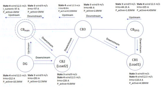 In Figure 8, while there are four different states for the operating conditions of the DFIG system discussed in Section 2, arrows representing power flow direction for states 3 and 4 have been illustrated for the sake of clarity and brevity of the lines. It is obvious from Figure 8 that with the change in wind speed from 9 m/s to 12.5 m/s variations in the RMS current, active power and power flow direction can occur through all CBs within the interconnected distribution network. Also, the dashed line circle in Figure 8 highlights the possibility of islanded mode operation as CBmain is removed from the state transition diagram. In fact, the advantages of identifying CBs with their operation states and connection links of neighboring protection nodes are considered the knowledge representation of the system which will be updated through the MAS architecture defined for the proposed MAPS. In the following, the process of representing system knowledge and applying the logic reasoning for decision making process within MAPS are discussed.