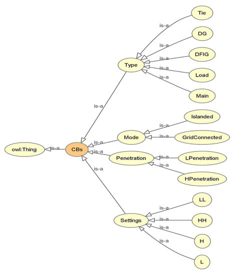 In utilizing the system information and process characteristics in Table 1 to incorporate heuristic decision-making algorithm into the proposed MAPS, interpretability of system knowledge into human understandable language is crucial to facilitate expert knowledge reasoning to select protection settings. Thus, knowledge representation based on a semantic web is adopted to build a human interpretable knowledge database via terms in vocabularies and relationships between the terms within a particular domain of study called ontology. Accordingly, a protection ontology for interconnected distribution networks is devised to represent system knowledge interpretable for human logic reasoning. The web ontology language (OWL) is used to further simplify the process of heuristic decision making by automatically presenting system knowledge for utilizing logical rules embedded as expert knowledge rule base. Figure 9 illustrates the graphical representation of defining protection ontology within interconnected distribution networks as knowledge about CBs and operation modes are represented in different categories and terminologies related to the specified domain ontology. As seen in Figure 9, information related to each CB can be represented through subclasses and relationships such as type of the CBs, mode of the operation, penetration level and setting groups which are critical for heuristic reasoning. Moreover, to improve interoperability and scalability required for MAPS, ontology-based knowledge representation has been adopted for system protection within interconnected distribution network.