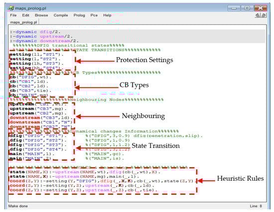 The second stage in defining heuristic element for decision-making over protection settings is driven by computational Artificial Intelligence (AI) which is able to perform human expertise reasoning on the presented ontological knowledge in the system protection domain. Therefore, the utilization of human mind capability in deriving logical conclusions/deductions from available knowledge constitutes the knowledge engineering phase in the establishment of a heuristic decision-making process. A software system using Programming Logic (PROLOG, Daniel Diaz, Free Software Foundation, Boston, MA, USA) language has been used which takes into account system knowledge as a collection of facts expressed in the form of descriptive logic language (human understandable) and rules of heuristic knowledge are applied to infer the outcome for the decision-making process. Thus, in simple form designing the embedded heuristic decision making for protection system is an interaction between real-time sensory data collected from the environment and rules of common sense expertise explored through the analysis of the protection system performance to select appropriate protection setting for TOC protection function. In Figure 10, a snapshot of the PROLOG program integrated within a coordination agent as knowledge database has been represented. As seen in Figure 10, information about particular components of the power system such as CB types, settings and states of the CBs are added for knowledge representation based on the protection-defined domain ontology. Although for particular CBs types such as DFIG and MAIN knowledge about state transitions is updated dynamically since any changes in operation condition of the aforementioned elements cause an alteration in the fault current contribution and invoke a modification of the knowledge database. Finally, rule sets at the bottom lines of the knowledge database introduce the knowledge engineering process where protection group settings are inferred from generalization of cause-effect knowledge for system protection within the interconnected distribution network.