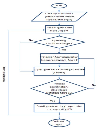 Basically, the above knowledge database is used to query for selecting protection settings with respect to operating condition/operation state of the CBs which are asserted in a database as system knowledge. However, MAS are considered as distributed elements which update the knowledge database in cycles by collecting required information in terms of knowledge sharing between protection agents in protection IEDs. In Figure 11, procedures to fulfil the system protection task within MAPS has been illustrated through a flow chart diagram as a sequence of different tasks are is identified as embedded routines for each protection IEDs deployed in the interconnected distribution network.