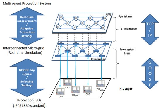The establishment of simulation platform for MAPS is defined on a multi-layered architecture where various subsystems and simulation domain solvers are coupled as an integrated system. In Figure 12, three layers of the simulation framework consisting of protection agents, power system components and protection IEDs have been illustrated. As shown in Figure 12, the concept of co-simulation between agent layer and power system has been introduced to couple two different simulation domains for exchanging real-time data between protection agents and power system components. The software tools which have been used for co-simulation are java agent development environment (JADE, Jade Software Corporation, Christchurch, New Zealand) and MATLAB/SIMULINK (MathWorks Inc., Natick, MA, USA where appropriate domain solvers are adopted to simulate protection agents and power system elements. Also, the communication protocol which has been used to synchronize real-time data exchange between SIMULINK and Agent layer is TCP/IP. The bottom layer represented in Figure 12 demonstrates HIL simulation techniques where protection IEDs are used to operate CBs in a SIMULINK simulation environment. The protection IEDs within the HIL layer have been configured for both publishing and receiving generic object oriented substation event (GOOSE) messages to send trip signals to a real-time simulation model of the power system and also adjustment of the protection settings in protection IEDs upon receiving GOOSE messages from an IEC61850 module configured in a real-time digital simulation model [38]. Finally, in Figure 12, communication protocols and exchanged information between different simulation environments have been represented by a two-sided arrow on the right and left sides of the layered architecture for MAPS development.