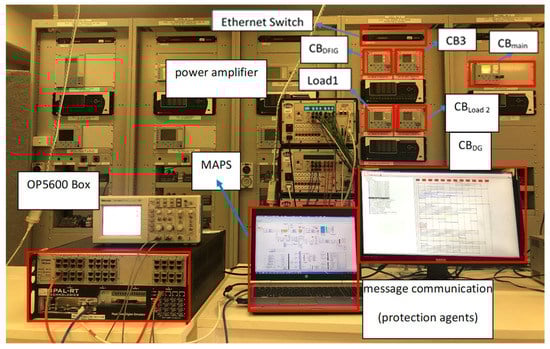 Following the proposed architecture for simulation framework of MAPS, developing testbed platforms to interface different hardware and software tools is critical to credibility and reproduction of simulation results under a real-world operation scenario. Therefore, a testbed platform integrating all the functional layers within MAPS has been developed where ICT infrastructure is embedded as communication medium to exchange real-time data between different components. In Figure 13, a testbed platform developed in the Victoria University Zone Substation (VUZS) laboratory has been illustrated where different hardware equipment including a real-time digital simulator (OPAL-RT-OP5600, Opal RT Technologies, Montreal, QC, Canada) protection IEDs (ABB-REF615, ABB Power Grids Australia Pty Limited, Queensland, Australia) power amplifier test unit (Doble-F6150e, Doble Engineering Company, Marlborough, MA, USA) a laptop and communication accessories such as Ethernet switches and cables have been used.