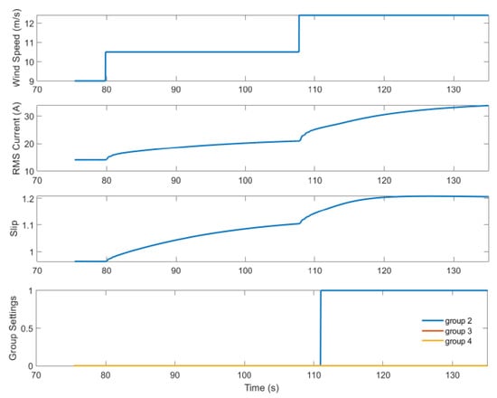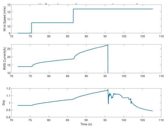 For the first scenario to evaluate the performance of MAPS against a conventional system protection setting, the effect of wind speed intermittencies on the operation conditions of the DFIG system is considered as an important factor to introduce complexities for system protection within an interconnected distribution network. Therefore, in order to evaluate potential drawbacks inherent to conventional protection settings in response to state transitions at the DFIG system connection point, a variation of the wind speed is simulated as a step input where the wind speed changes from 9 m/s to 12.5 m/s. In Figure 14, time domain responses of the RMS current and operation slip for DFIG system are plotted for step inputs of wind speed variation. As seen in Figure 14, under normal operating conditions, a state transition occurs due to the increase in wind speed which also leads to an increase in the RMS current at CBDFIG.