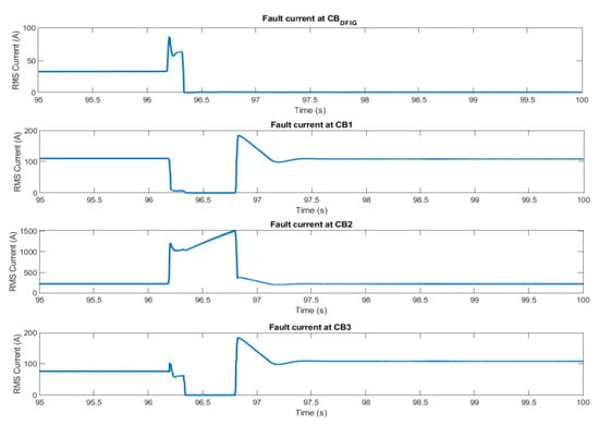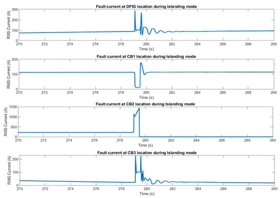 Another important operating condition for an interconnected distribution network is islanded mode operation where reliability and accurate operation of the protection system is critical for both power system quality and stability of the interconnected distribution network. Thus, an operation scenario for comparing system protection performance under islanded mode has been introduced for both a conventional protection system and the proposed MAPS to highlight its potential capabilities to deal with protection challenges within the interconnected distribution network. For islanded mode operation, a 3-phase fault scenario at CB2 location is applied to evaluate time-domain response of the protection system. In Figure 16, multiple plots are shown to present the fault current at different CB locations during fault period of 0.3 s. As it is obvious from Figure 16, due to low mass inertia and the reduced level of fault current contribution during islanded mode operation at CB2 (the 3rd plot from the top), the protection IED does not detect the fault in its protection zone. However, for DFIG system (the 1st plot from the top), although the faulty section of the line is located upstream of DFIG system at the lateral feeder close to load 2 (CB2), due to unresponsive setting for fault at CB2 location, sympathetic tripping occurs at CBDFIG. Similarly, the problem related to aforementioned system protection challenge is rooted in a conventional protection strategy where fixed protection settings are adopted to address various operating conditions within an interconnected distribution network.