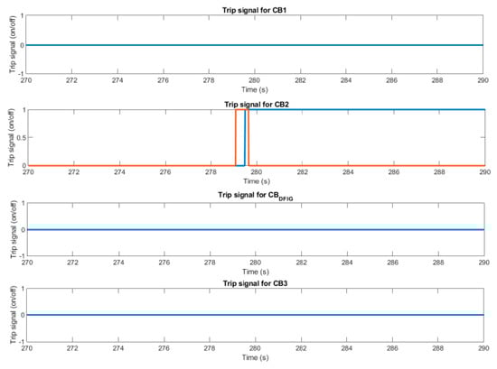 In Figure 18, the trip signals received from protection IEDs used for HIL configuration of the protection IEDs have been represented where trip signal for CB2 (the 2nd plot from the top-solid blue line) is activated to open CB2 within real-time simulation environment in MATLAB/SIMULINK as other CBs remain closed.