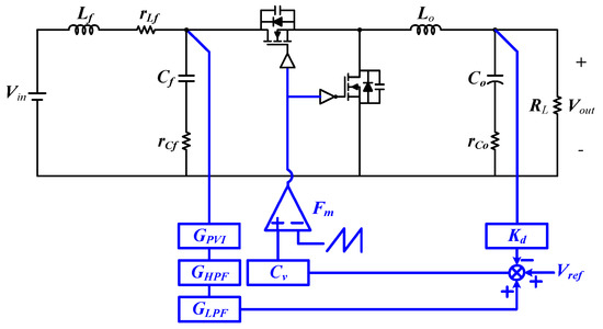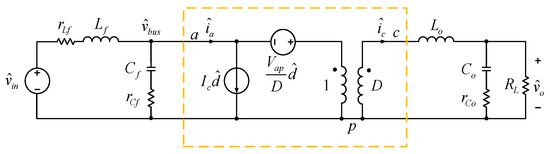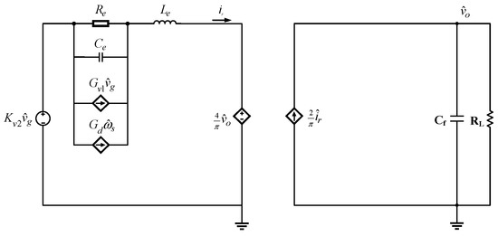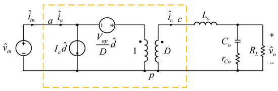 Notably, this control block is derived using the small-signal model of a simple post-converter. Taking the Buck converter as an example, referring to the Buck small-signal model of Figure 4, the input voltage symbol is changed to , and the input current is changed to . Then, we can obtain the following: