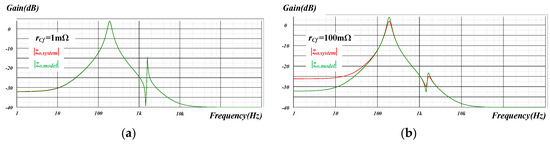 However, the direct series approximation method must pay attention to the voltage disturbance value on the previous stage’s output capacitor. Under the general design, the capacitor’s voltage ripple value comes from the parasitic series resistance (ESR) of the selected capacitor. Therefore, the more significant the ESR of the intermediate stage capacitor, the more significant the error of small signal model directly connected in series. Figure 6 is a Bode plot of the open-loop Buck converter’s output impedance with an LC filter in series with different rcf. The remaining circuit parameters are D = 0.5, Lo = 33 μH, Co = 2.2 mF, rC o = 10 mΩ, Cf = 100 μF, Lf = 1 mH, rLf = 100 mΩ, RL = 3 Ω. We can verify from the results of Figure 6a,b that when the rcf is large, the error between the small-signal model and the actual system will be significant. Therefore, in the design, the capacitor with smaller ESR is used as much as possible. Apart from increasing the overall converter efficiency, it also helps simplify the analysis of small signals.