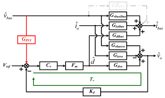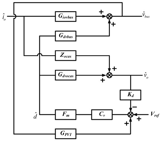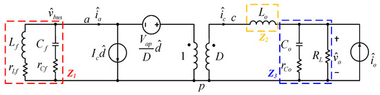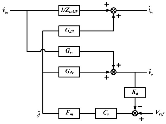 As can be seen from the deduction of Section 5, the control block constructs ZPVI. Therefore, when discussing the overall converter’s output impedance, the small-signal model of the converter cannot be directly connected in parallel with the physical resistance, which must be re-derived by the control block. When discussing the output impedance in a closed loop, the input voltage disturbance is set to zero, and the disturbance current is fed from the output to observe its disturbance to the output voltage . Given that the duty cycle disturbance in the closed-loop system is controlled by the output voltage and the interstage voltage , the duty cycle disturbance is not zero when discussing the closed-loop output impedance. Figure 16 illustrates a small signal model referring to Figure 5, setting the input voltage disturbance to zero and discussing the closed-loop output impedance’s small-signal model.