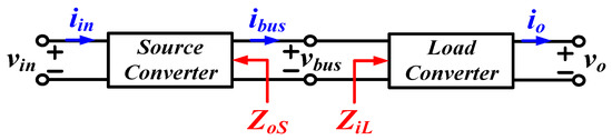 The main point of the series converter’s design is to first focus on the stability of the two-stage series and then to the overall output impedance of the series converter. In the discussion of stability, the Middlebrook stability criterion [5] has existed for many years. It uses the correlation between the input and output impedance of the front and back stages to explain the series system’s stability. With Middlebrook’s theory of stability criterion, several methods for solving series stability have been proposed one after another. Roughly three types of methods are available: the first category refers to the passive components to increase system damping [6,7]. A reliable and straightforward circuit characterizes this method, but the circuit increases additional losses by adding passive components and resistance. The second category is the process of dynamically increasing the decoupling capacitance [8]. Although this type of method reduces losses than the first type, it increases the complexity of control and the number of components used and reduces the overall converter’s power density and reliability. The third type is the process of feeding the virtual impedance [9,10]. This type of method uses sampling voltage and current signals to add to the original control loop in the form of control blocks to achieve virtual impedance. Compared with the second type, the overall converter’s power density can be maintained because no additional power components are required.