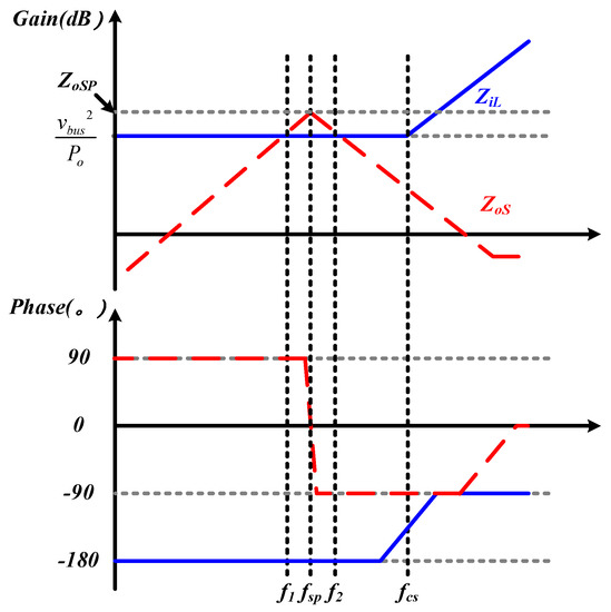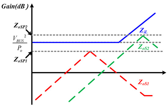 As can be seen from Equations (16)–(20), even if the previous stage’s converters and the later stage are stable when the ratio Tm between the output of the front- and post-stage converter’s input impedance is unstable, the overall series system will remain unstable. This phenomenon is Middlebrook’s stable criterion. Figure 11 is a Bode diagram of the output impedance of the front stage and the rear stage’s output impedance in a typical unstable series system. Its circuit characteristics can be regarded as an LC filter in the front stage and a power converter with a constant power load in the rear stage. The symbol ZoSP is the peak value of the output impedance of the previous stage. According to the derivation in Section 3, the closed-loop input impedance of the fixed power load’s power converter is a specific value. Moreover, the particular value can be derived according to the following steps.