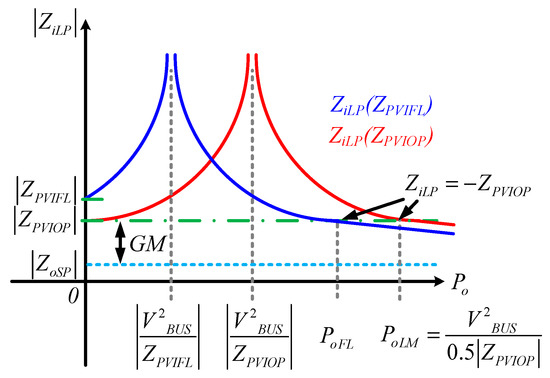 Therefore, the full load wattage PoFL of the designed converter must be less than PoLM. However, the ZPVI design method is based on the fully loaded PoFL, and the result is shown as the curve ZiLP (ZPVIFL) in Figure 14. To make the overall input impedance equal to |ZPVIOP| under full-load PoFL and any load below full-load PoFL can have more than GM gain margin, the right half of the curve ZiLP (ZPVIOP) must be selected. The two lines of curve ZiLP and level |ZPVIOP| must intersect when the load point is PoFL; at this time, . The design formula of ZPVIFL is as follows: