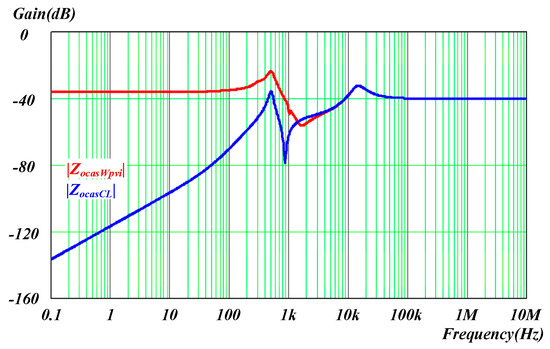 We now compare the numerator terms of ZocasWpvi and ZocasCL. Figure 20 is a Bode plot of |Num(ZocasWpvi)| and |Num(ZosCasCL)|. By observing Figure 20, |Num(ZocasWpvi)| can be seen as higher than |Num(ZosCasCL)| in the low-frequency band. Then, we compare the numerator terms of ZocasWpvi and ZocasCL. Figure 20 presents a Bode plot of |Num(ZocasWpvi)| and |Num(ZosCasCL)|. By observing Figure 20, |Num(ZocasWpvi)| can be seen as higher than |Num(ZosCasCL)| in the low-frequency band.