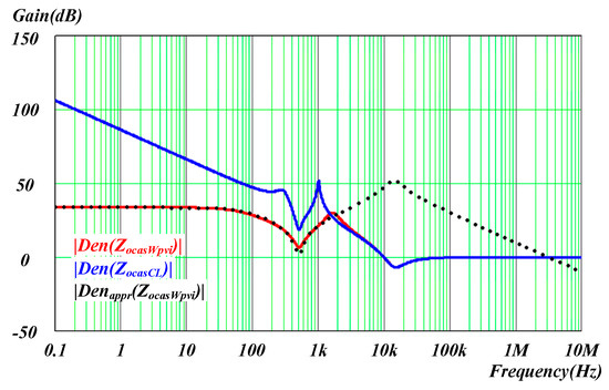 Figure 18 is a design example to compare the Bode plot of |ZocasWpvi| and |ZocsCL|. Table 1 and Table 2 in Section 7 show the circuit parameter values nd compensator design parameters. This section uses the GPVI parameters of the exact solution described according to Equation (32). The GPVIappr parameters listed in Table 2 are simplified versions, which are easily implemented in analog circuits.