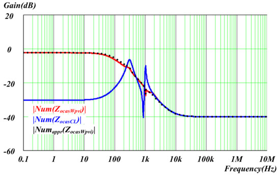 As can be seen from Equations (48) and (50), in the case of low-frequency response and D2rLf is much smaller than RL, |Num(ZocasWpvi)| is higher than |Num(ZosCasCL)| in the low-frequency band. Figure 20 also points out that |Numappr(ZocasWpvi)| and |Num(ZosWpvi)| coincide in the low-frequency band.