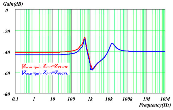 Reviewing Equation (47), we can find that the gain of Denappr(ZocasWpvi) is proportional to ZPVI. That is, the larger the ZPVI, the smaller the |ZocasWpvi|. With Figure 14 and Equation (29), we can see that to minimize |ZocasWpvi|, the design of ZPVI should choose ZPVI = ZPVIFL. Figure 21 presents a Bode plot comparing |ZocasWpvi| under different ZPVI. From Figure 21, |ZocasWpvi| is found to have the minimum value under the design with ZPVI = ZPVIFL.