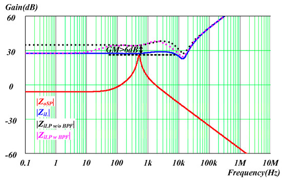 ZiLP (ZPVIOP) in Figure 14 is a curve of |ZiLP| designed with the output no-load as the starting point. When the post-stage converter is no-load, the overall input impedance of the post-stage contains only ZPVIOP. Thus, the design of ZPVIOP must only consider the peak value of ZoSP and the required gain margin GM. The design formula of ZPVIOP is as follows: