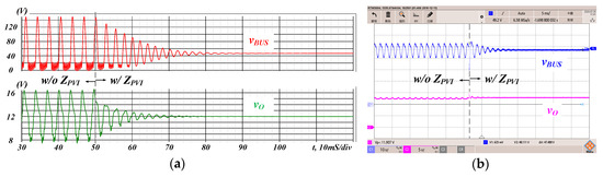 After analyzing the frequency domain response, Figure 24 presents the time domain verification results. Figure 24a shows the simulation result. The virtual impedance is not added before t = 50 ms, and the system shows oscillation. After t = 50 ms, the virtual impedance feedforward loop is added to the system, and the system is stabilized. Figure 24b shows the test result of the physical circuit. Moreover, before the virtual impedance feedforward is added, the system shows oscillation. After putting in the virtual impedance feedforward loop, the system returns to stability. In Figure 24b, the voltage disturbance amplitude when vBUS and vO are unstable is smaller than the voltage amplitude under ideal conditions. The reason is that the voltage source used in the experiment is not an ideal voltage source. It only has a unidirectional power transmission function instead of bidirectional power transmission and contains its equivalent series impedance. Therefore, the simulation results using an ideal voltage source are different from the actual experimental results. However, the experimental results can still highlight adding virtual impedance to stabilize the series system.