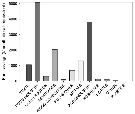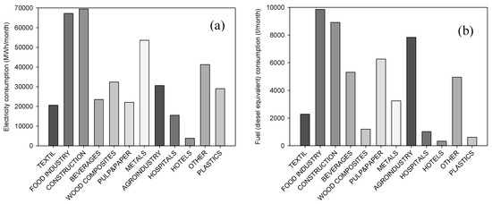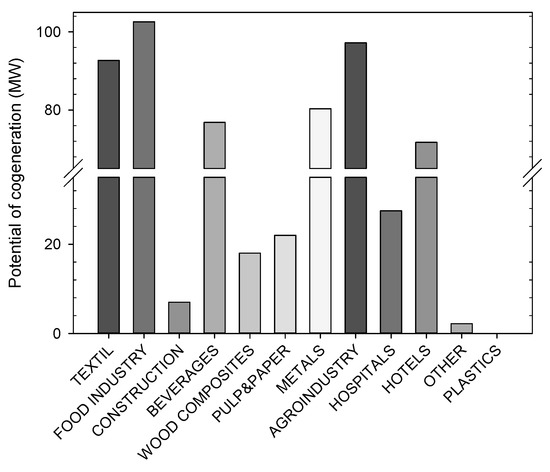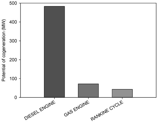 - The selection of the prime movers also considered possible partial loads requirements (i.e., the ability to vary thermal and electrical output depending on hourly requirements, or the necessity for frequent stopping and starting). Consequently, diesel and/or gas engines are preferable for cogeneration instead of gas turbines or steam turbines coupled with boilers in companies that do not operate 24/7. Diesel and gas engines, additionally, are able to run with renewable fuels (biodiesel and biogas, respectively), which are expected to be available in the country in the future [79] (See Section 3.2).