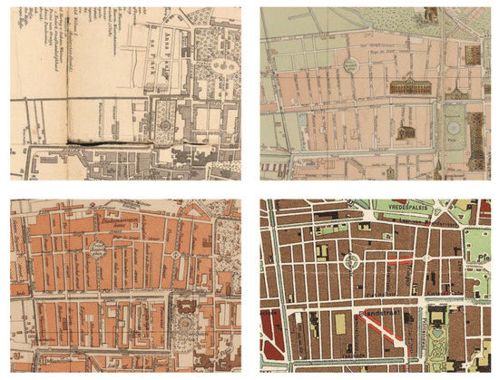 Occasionally and exceptionally an ideal street pattern was designed following examples of neighbourhoods in great European metropoles of the 19th century, street grids with a rond-point in their centre and a monument. The most abstract street pattern in these neighbourhoods is the deformed grid with perimeter blocks and neighbourhood enclosure streets between the main roads. A neighbourhood enclosure street is sometimes linear with a streetcar or forms a cross with a rond-point in its centre accommodating a monumental building, statue, fountain or small park. Public buildings are often found along main roads and shops are traditionally located along the crossing neighbourhood enclosure streets. Public buildings stand along main roads on the edge of the neighbourhood. Often these two types of streets are connected to older streets and roads that connect the neighbourhood to the city. In the case of the Zeeheldenkwartier, the edge of the neighbourhood along canals and main roads were already constructed before the grid was laid out. Furthermore, streets patterns became enhanced with the introduction of automobiles and urban renewal projects. In the interbellum there was a monumental reconstruction of the Vondelstraat by the architect Berlage. Historic maps (Figure 3) shows the irregularities of this abstract scheme. The small squares in the urban pattern are introduced in the urban renewal period.