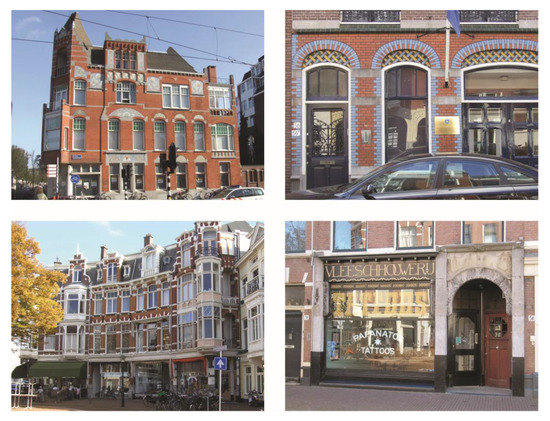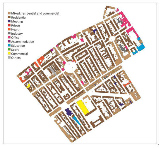 Figure 8 shows is a relation between the building type, its use or function and the kind of street it is on. The function of a building is defined in the building act (Bouwbesluit) [44] as either for living, meeting, detention, health, industry, office, guest accommodation, educational, sport, shop or another functionality. All of these functions are recorded in neighbourhood zoning plans. The first suburbanisation of old neighbourhoods are the modern hybrid neighbourhoods of today’s cities. Usually shops, small businesses, restaurants, bars, and guest accommodations are found along the neighbourhood’s enclosure streets. Along the main streets and edge of the neighbourhood are supermarkets and public amenities such as schools and healthcare facilities.