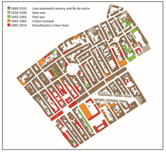 The map of Figure 7 shows the periodisation of buildings and their typology. The most dominant residential building is the brickwork townhouse from the period 1860–1910. By determining age and type of the housing stock (in relation to energy efficiency) the Agentschap NL and Ministerie van Binnenlandse Zaken en Koninkrijksrelaties (2011) developed a classification system to reference houses based on major changes in legislation [19]. This periodisation is used by architectural historians and municipalities for various publications and is linked to important changes in society, which lead to changes in legislation on buildings and urban planning. Important milestones on building legislation are the local Politieverordening of the 19th century, local Bouwverordening 1905-45, Bouwverordening 1946–1991, Bouwbesluit 1992–2020, and Besluit Bouwerken Leefomgeving 2021 [43].