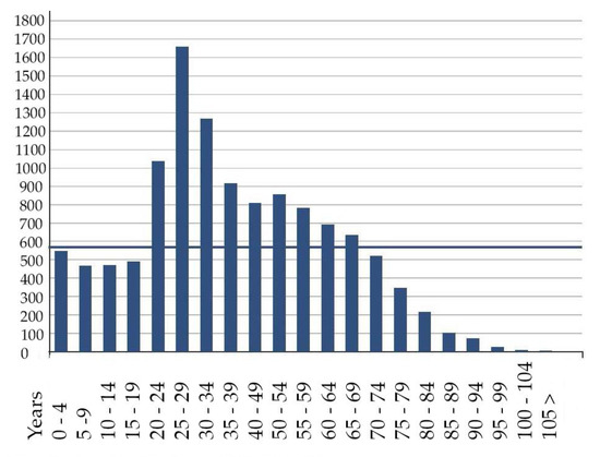 Appendix B shows young inhabitants and small households living in small apartment units or split townhouses of 1 to 3 rooms without a lift. By 2018 the population had grown to 11,853 inhabitants and 6767 households. There were 3918 single households, 1557 households without children, 839 households with children and 453 single-parent households with children [46]. Other data shows the growing population and density to 14,343 people per km2 (Netherlands 507). The address density showed 6544 per km2 (Netherlands 1978), 69% of residents unmarried (Netherlands 48%) and 20% married (Netherlands 39%). Furthermore, 39% of the population is 25 to 45 years old (Netherlands 25%). Figure 10 shows the number of various age groups residing in the Zeeheldenkwartier. The growth of small one to two person households between the ages of 20 and 29 living in small rental apartments (split townhouses) and the amount of cars in the streets is astonishing [40].
