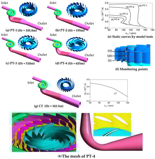 Computational domains of the pump-turbines (PT) and conventional turbine (CT), the schematic of monitoring points, and mesh information.