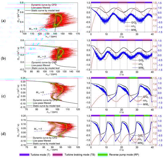 The time histories of the main macro parameters during the runaway processes are also shown in Figure 2. Generally speaking, the dynamic histories of PT-1 and PT-2 show damped oscillations, while those of PT-3 and PT-4 demonstrate undamped oscillations. The working points of PT-1 and PT-2 go through the turbine (T) and turbine braking (TB) modes, but do not enter the reverse pump (RP) mode, and the macro parameters fluctuate in the T and TB regions with gradually decreasing amplitudes. On the other hand, the working points of PT-3 and PT-4 not only go across the T and TB modes, but also go down to the RP mode, and fluctuate periodically in these three modes. Overall, the fluctuation periods of the macro variables of the four pump-turbines are about 11.5, 10, 14.4, and 9.6 s, respectively, though the inertia values of rotating parts are the same (Table 1) in the simulations. The periods are also influenced by the rated rotating speed, discharge, and output. In addition, the maximum rotational speeds are heavily affected by the above factors [27,28], and can reach more than 1.4 times that of the initial value in PT-1 but less than 1.2 times in PT-4.