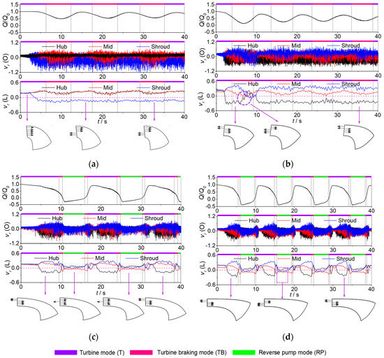 The aforementioned fluctuations of dynamic trajectories are closely related to the unstable flow patterns near the runner inlets and outlets [29]. The variations of flow velocity at the runner inlet can reasonably demonstrate the characteristics of flow evolutions during the runaway processes. Figure 3 show the variations of normalized radial velocity vr at the three monitoring points (HS, MS, and SS shown in Figure 1f, namely hub side, mid span and shroud side, respectively) in the four runners. The normalized velocities were defined by: