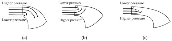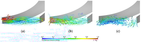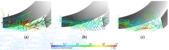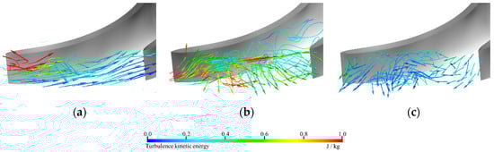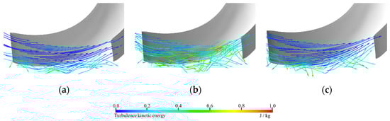 As shown in Figure 8, it can be seen from the filtered-data that in the early stage of runaway, the pressures at the monitoring points are approximately the same and there is no backflow. With the increase in rotating speed, the centrifugal force increases but the discharge decreases, then the pressure gradient between the hub and shroud sides becomes larger, resulting in water flows from the higher-pressure side to the lower one. Here, the blade lean angle affects the distribution of pressure gradient and leads to the different initial position of backflows. The negative lean angle of PT-1 forces the pressure to increase on the hub side, which makes the water turn from the hub side to middle and shroud ones, leading to backflows on the shroud side Figure 18a. On the contrary, the backflows in PT-2 generate from the hub side due to the existence of a positive lean angle Figure 18b. Although there is no lean angle in PT-3 and PT-4, the pressure gradient distribution in them is consistent with that in PT-2, therefore the backflows all generate from the hub side Figure 18c.