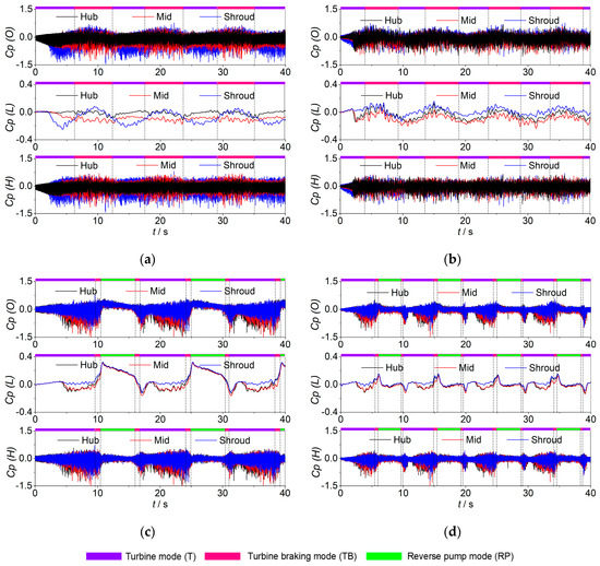 where p is the instantaneous pressure signals, pinitial is mean initial pressure values at the initial time, ρ is the water density, and u1 is the tip velocity of the runner blade leading edge. In addition, Cp (O) and Cp (L) in Figure 8 are the original and low-pass filtered data, respectively, and the upper frequency limit of the low-pass filtered data is 2 Hz.