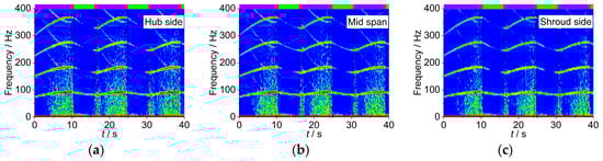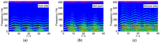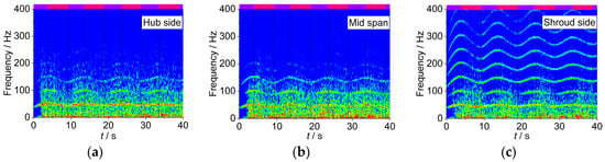 Frequency spectrums for pressures at the monitoring points of PT-4: (a) at hub side, (b) at mid span, (c) at shroud side.