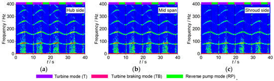 For each runner, the amplitudes of pressure pulsations in different locations at the runner inlet are also different. In PT-1 and PT-2, the differences of pressure pulsation characteristics at the three monitoring points Figure 8 are quite large, while those in PT-3 and PT-4 are smaller. Taking PT-1 as an example, with the runaway beginning, the radial velocity at the inlet decreases obviously, and the low-frequency signals gradually generate at each monitoring point. Once the backflows occur on the shroud side, the amplitudes increase rapidly. Compared with pressure fluctuations at the three locations, the duration of the low-frequency signals is the longest on the shroud side, and they exist in the whole S-shaped region, because the backflows keep staying at this location all of the time. However, the highest amplitudes of low-frequency signals are at the mid span, while the lowest ones are on the hub side, and there are only low-frequency signals at the runaway point. In PT-2, the same phenomenon as in PT-1 is that the location with the highest amplitudes is also at the mid span, though the backflows occur on the hub side. In PT-3 and PT-4, there are no significant differences in the frequency of pulsations in different locations.