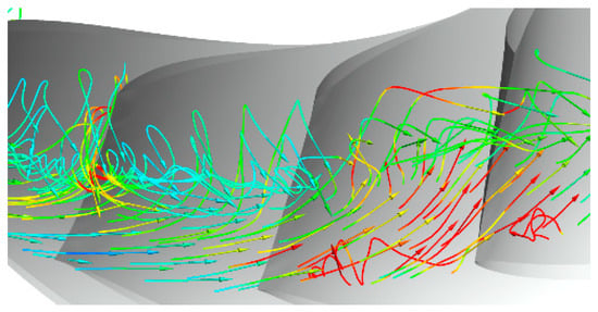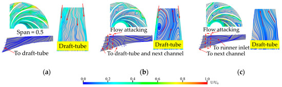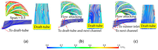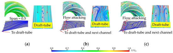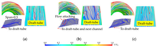 Even if the radial velocity at the runner outlet cannot be exactly monitored like that at the inlet, the outlet backflows can be observed clearly from the flow patterns in the draft-tube and near the blade suction side as seen in Figure 13, Figure 14, Figure 15 and Figure 16. After the working point enters the S-shaped region, the streamlines in the blade channels are no longer as smooth as before. The main flow will enter the draft-tube along the side wall, or return to the runner from the draft-tube center, due to the changes in rotational speed and discharge [31]. As mentioned before, whether or not the working point enters the RP mode can lead to large differences in flow patterns, which has no exception at the runner outlet. For PT-1 and PT-2 (Figure 13 and Figure 14), although the total flow rate is mainly in the turbine direction, the main stream water flow attacks the blade suction side from the draft-tube center, because of the increase of the pumping effect. Some water jumps into the nearby runner channel, and some go back to the draft-tube. Also, this phenomenon will be very obvious when the minimum discharge condition is approached. But in PT-3 and PT-4 Figure 15 and Figure 16, the working points also enter the RP mode, and the flowing directions reverse to the pump direction. At this time, a part of water flow enters the upstream along the suction surface, and a part escapes to the next blade channel, and a little water returns to the draft-tube.