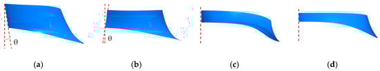 Lean angles of the blade leading edges of the four pump-turbines: (a) PT-1, negative lean angle, (b) PT-2, positive lean angle, (c) PT-3, no blade lean, (d) PT-4, No blade lean.