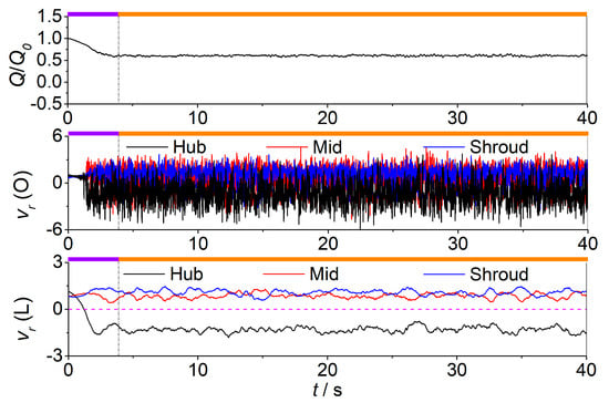 where Ur is the instantaneous radial velocity, n1 is the initial rotational speed, and D1 is the runner inlet diameter. Here, positive values of vr are defined as the direction of water flowing into the runner passages, while negative values of vr mean the backflows from the runner passages to the vaneless space. In addition, vr (O) and vr (L), in Figure 3, are the original and low-pass filtered data, respectively, and the upper frequency limit of low-pass filtered data is 2 Hz.
