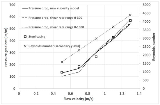 For completeness, it is useful to explain the measurements shown in Figure 1 more thoroughly. The measurements at the two lowest velocities were conducted while the flow was laminar. For the higher flow rates, the flow gradually become more and more unstable for finally becoming turbulent as the flow rate increases. It should be noted that the measurements shown in Figure 1 are conducted for flow in a cased hole. Ytrehus et al. [19] has shown that the frictional pressure losses generally become higher in open hole sections compared to that of flow in the cased hole sections. A change from cased hole to open hole sections during flow in laminar flow conditions have lesser differences on the frictional pressure losses.