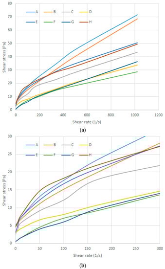 Flow curves of eight drilling fluids. (a) Upper figure—Full shear rate range; (b) Lower figure—Relevant shear rates.