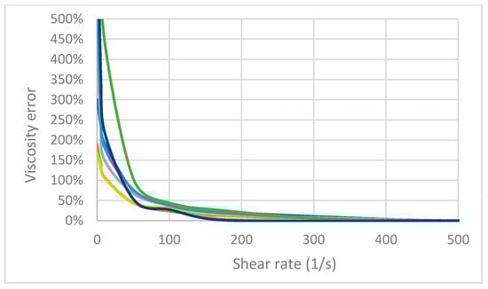 Viscosity error as function of shear rate by using yield point (YP) and plastic viscosity (PV) in accordance with API/ISO specifications [2,3,4] for the selection of laboratory measurements.