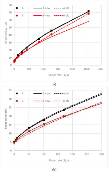 Flow curves of drilling fluids A and B. (a) Upper figure—Full shear rate range; (b) Lower figure—Relevant shear rates.