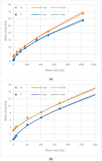 Flow curves of drilling fluids D and F. (a) Upper figure—Full shear rate range; (b) Lower figure—Relevant shear rates.