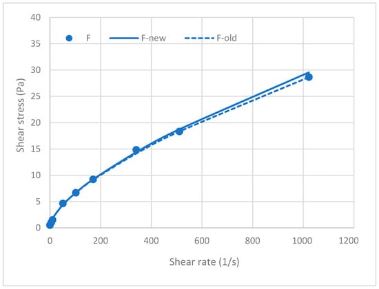 To measure the sensitivity of the model due to the curvature exponent, n, in the model based on dimensionless shear rates, the value calculated for the model constructed in accordance with the standards [2,3,4] is used. In this case the shear stress measurements at the shear rates 511 and 1022 1/s measurements are used. In principle, it is expected that both models should give approximately equal results, with the dimensionless shear rate model being more accurate around the shear rate of 170.3 1/s and the traditional being accurate around the 1022 1/s shear rate. The results for fluids A, B, D and F, shown in Figure 7, confirm this hypothesis. Each fluid is forced to have equal yield stress independent on choice of model. The curves labelled “new” was also forced to use the shear stress reading at the shear rate 170.3 1/s Normally, a shear stress measurement in the relevant shear rate range is used to determine the curvature index, or the flow index, in the dimensionless shear rate model. In the case shown in Figure 7 the curvature index is selected from the two highest shear rates following the standards [2,3,4] for all the measurements. The fluids labelled “old” in this figure have also the fluid consistency factor calculated at the shear rate 511 and 1022 1/s as described by standards [2,3,4].