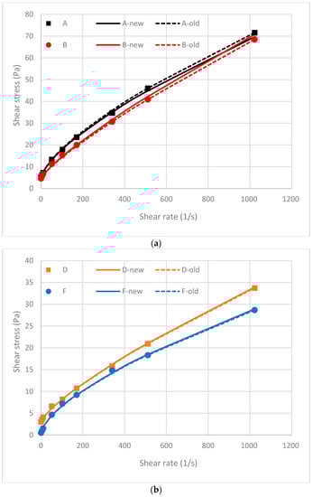 Flow curves of drilling fluids using the dimensionless shear rate and the shear stress at 170.3 1/s and the flow index, n, calculated from the values calculated at the shear rate of 511 and 1022 1/s. The fluids labelled “old” have also the fluid consistency factor calculated at 511 and 1022 1/s. (a) Upper figure—Fluids A and B; (b) Lower figure—Fluids D and F.