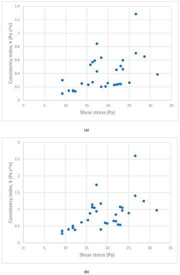 The consistency index, k (Pa·sn) as a function of the shear stress measured at the shear rate of 170.3 1/s for a large number of drilling fluids. Shear stresses in Pa. (a) Upper figure—The Herschel-Bulkley model consistency index; (b) Lower figure—The power law model consistency index.